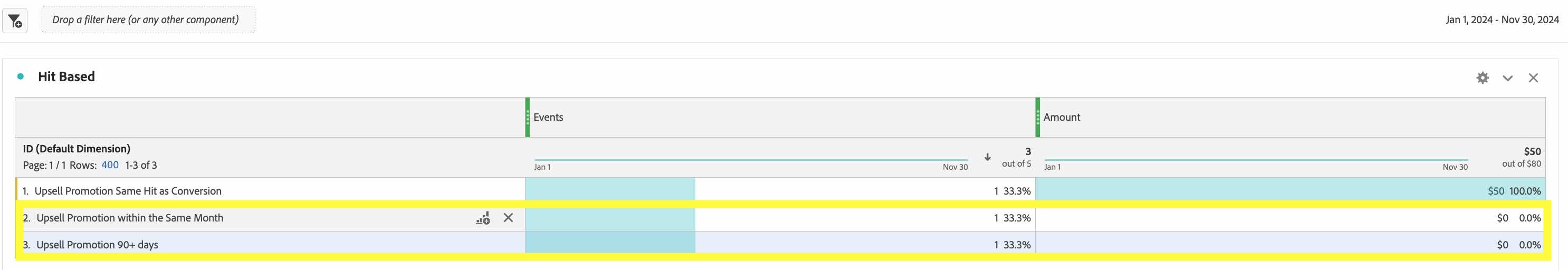 1. As expected, the default ID dimension (which has no allocation and expiration settings and is in effect a hit-based dimension for wherever the field upsells.upsellImpressions.ID is set), shows the $50 transaction that occurs on that same exact hit. Also as expected, the promotional impressions for the other two scenarios are not associated with any transaction amounts: