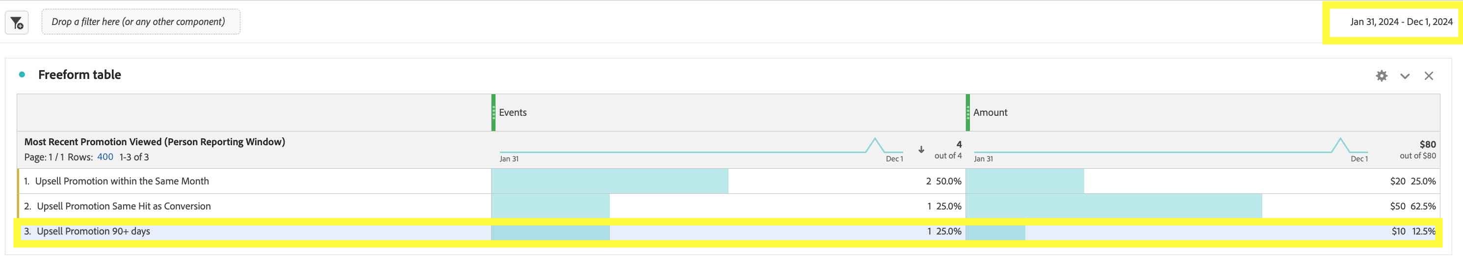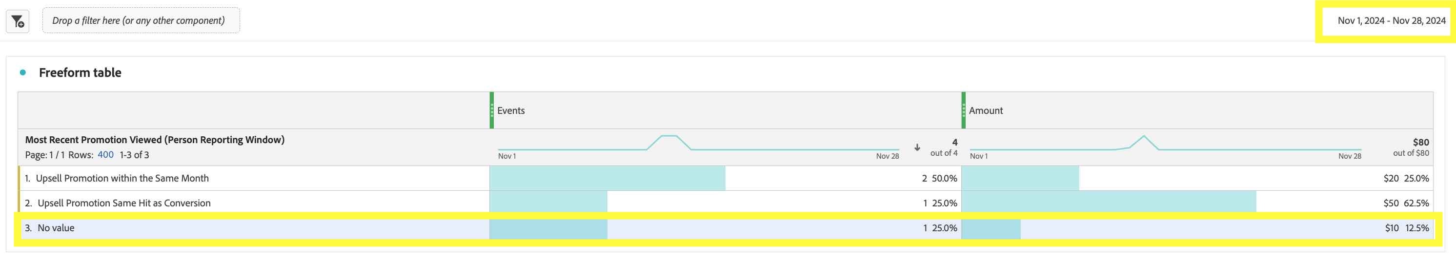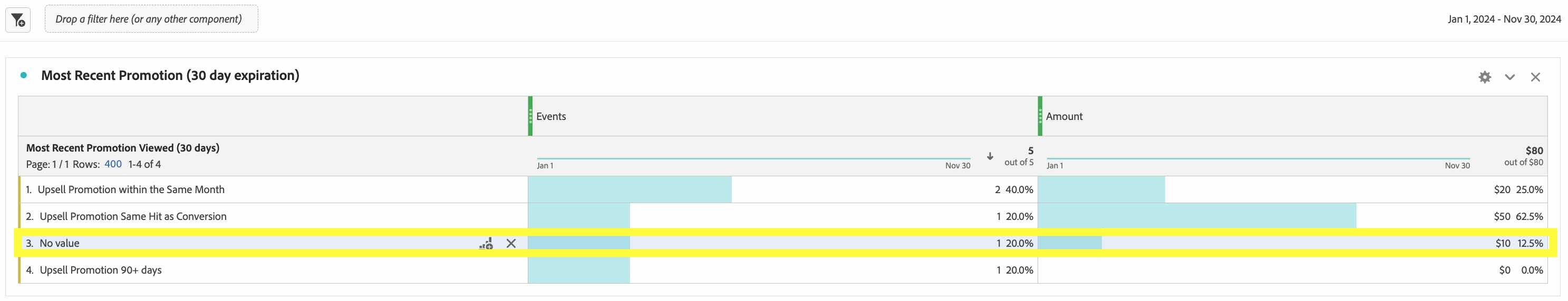 2. Looking at the 30 day expiration panel, we can see that this dimension indeed stops attribution at 30 days—Scenario 3 with promotion value of "Upsell Promotion 90+days" is not associated with any dollar value. We can also see that the $10 generated by this visitor are being attributed to the "No Value" line item.