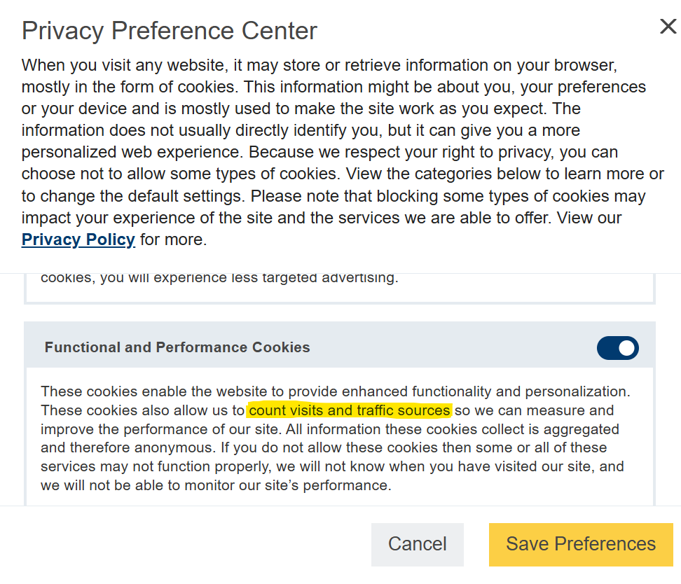 Some background: Our marketing site is multi-country and is the global public face of our company. For US properties, the default mode is full tracking opt-in with the ability to selectively opt out of 3 separate "tracking cookie" categories from the "Manage My Cookies" option: